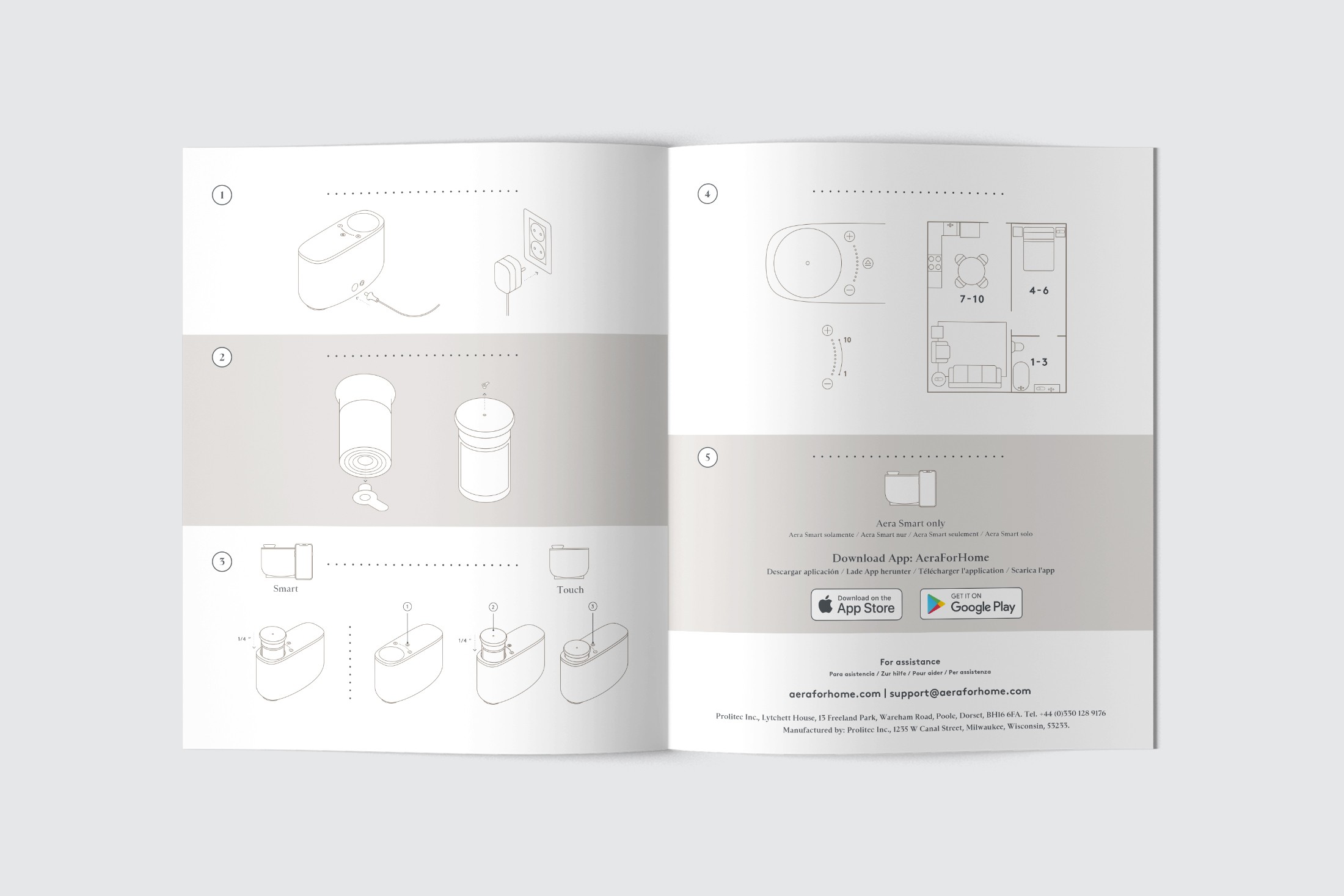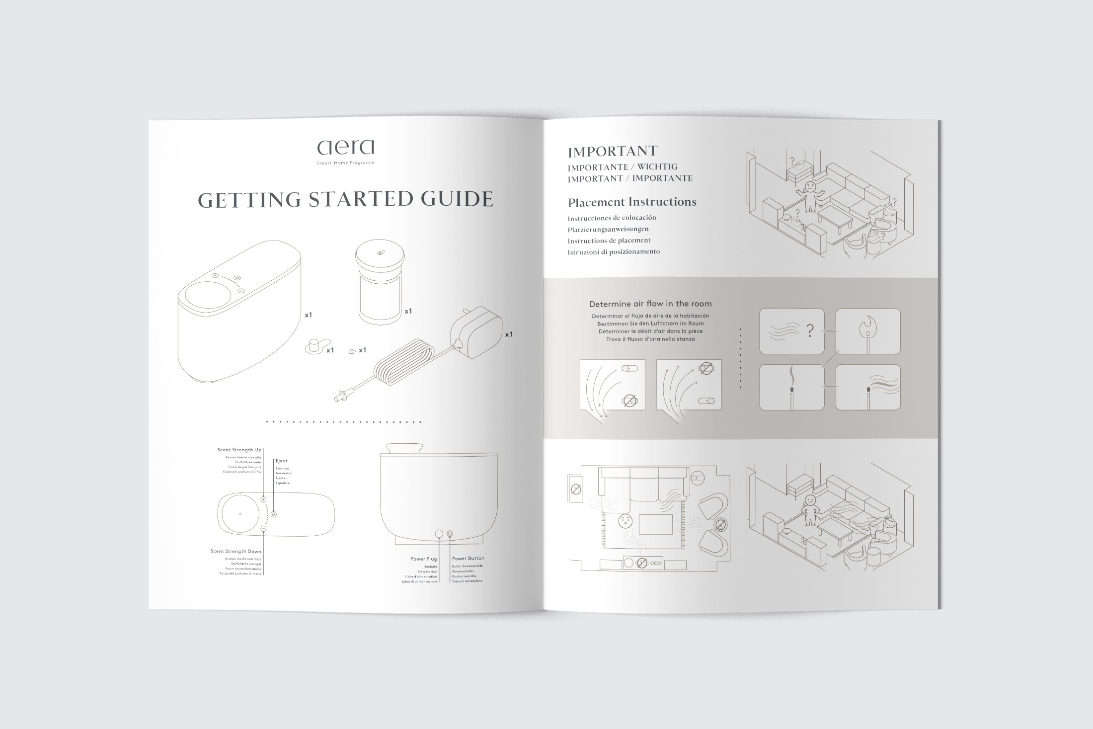 A series of illustrations for a multi-language guide to using an Aera diffuser.