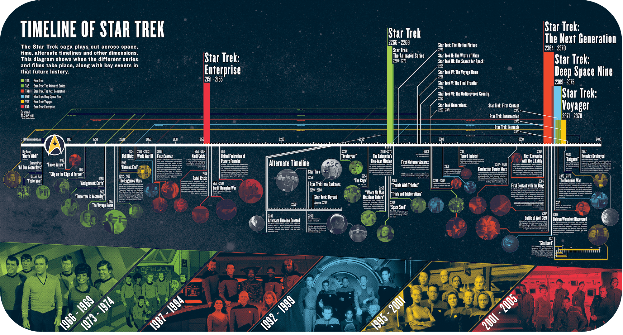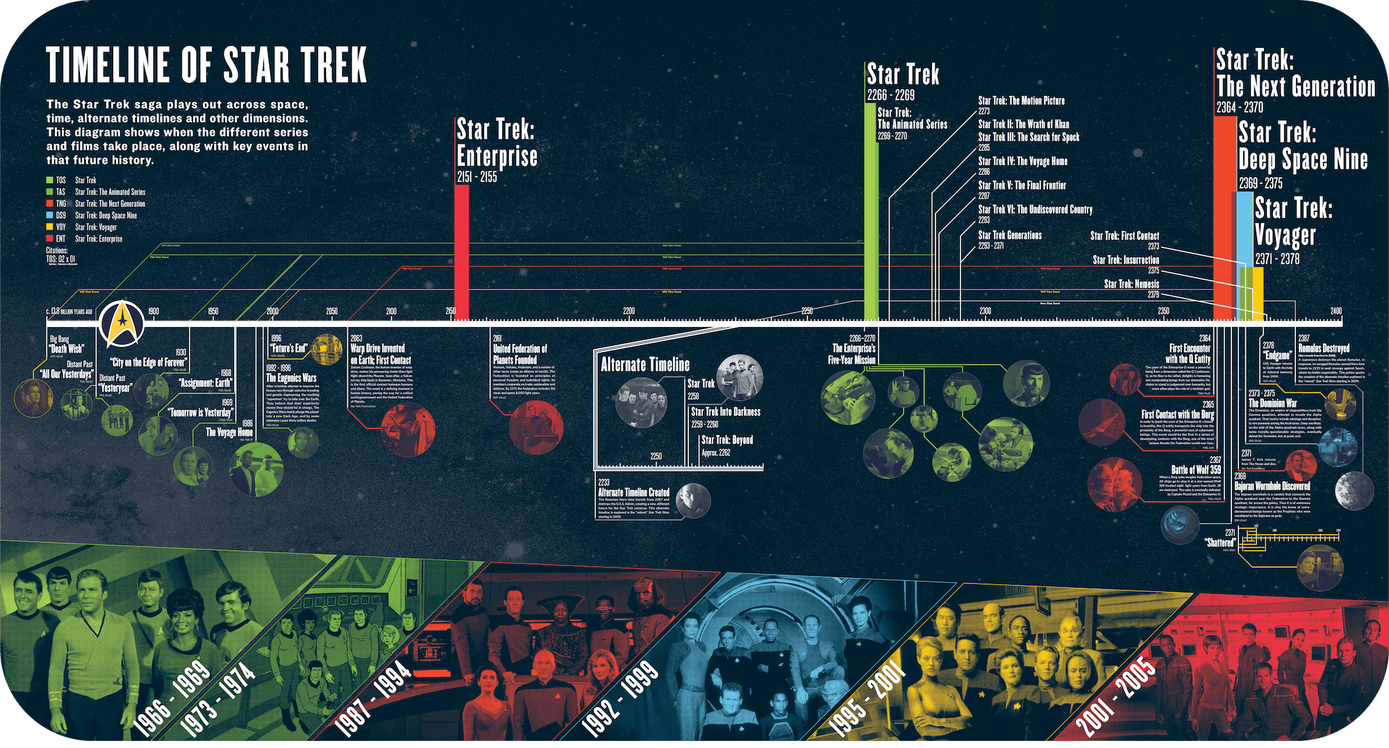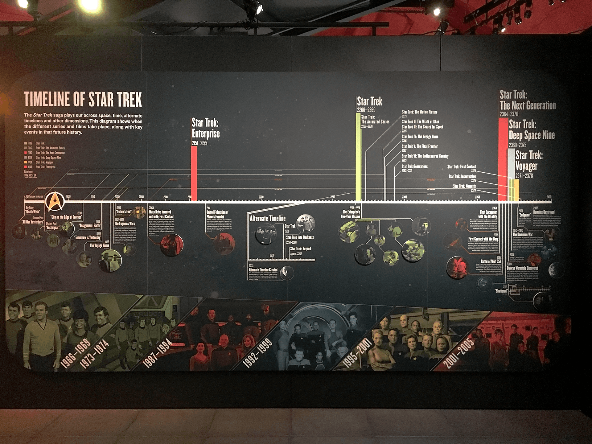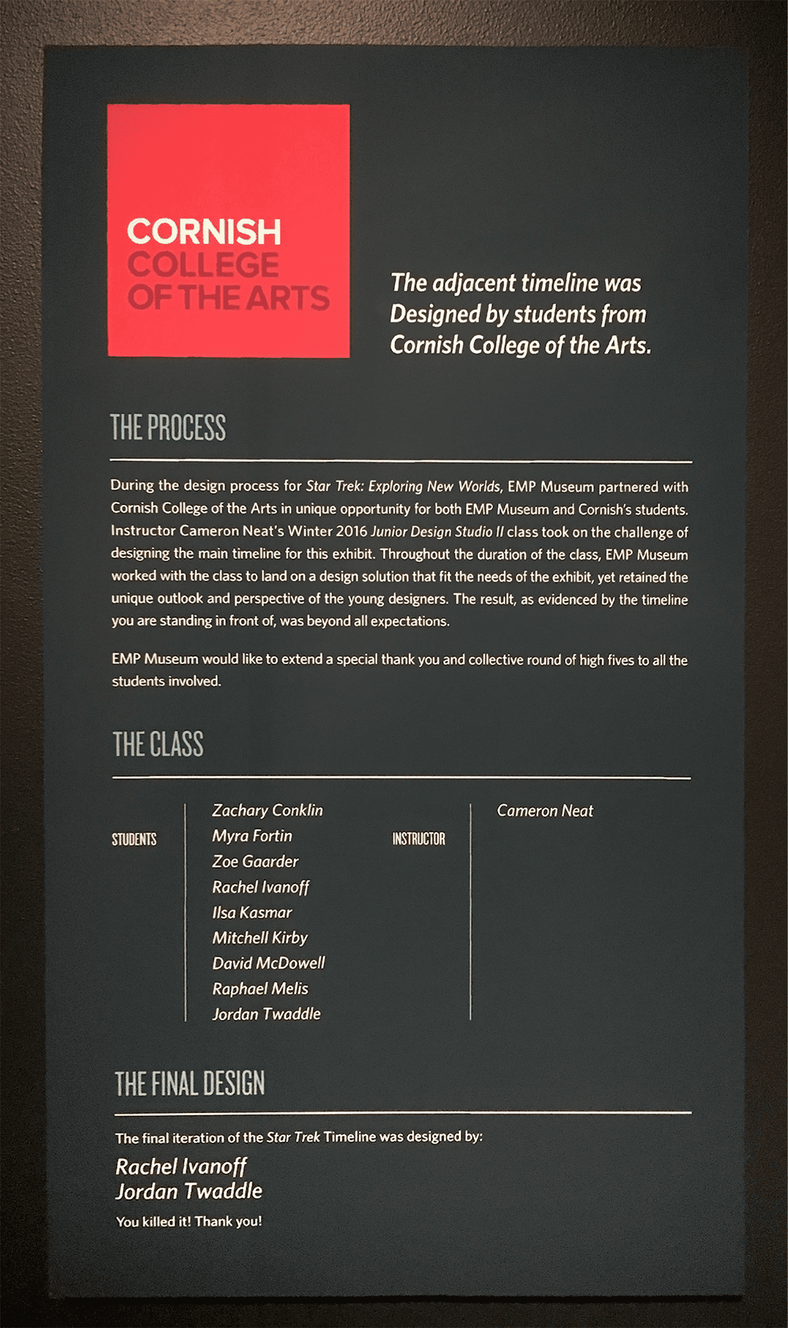 In this project we, Rachel Ivanoff and myself, designed an 8' x 15' timeline for the exhibit Star Trek: Exploring New Worlds at the Museum of Pop Culture [MoPOP], formerly the EMP. The timeline details the fictional history of the Star Trek universe and features key events, their placement in the history of the series and movies, alternate timelines and the time travel of characters such as Kirk and Janeway. While developing our concept and design, Matt Cole, Exhibit Graphic Designer at the MoPOP, gave guidance and direction on the project. The project culminated in a final presentation of our design to a panel of representatives from the MoPOP. Our design was chosen to be manufactured and is displayed in the Star Trek exhibit.