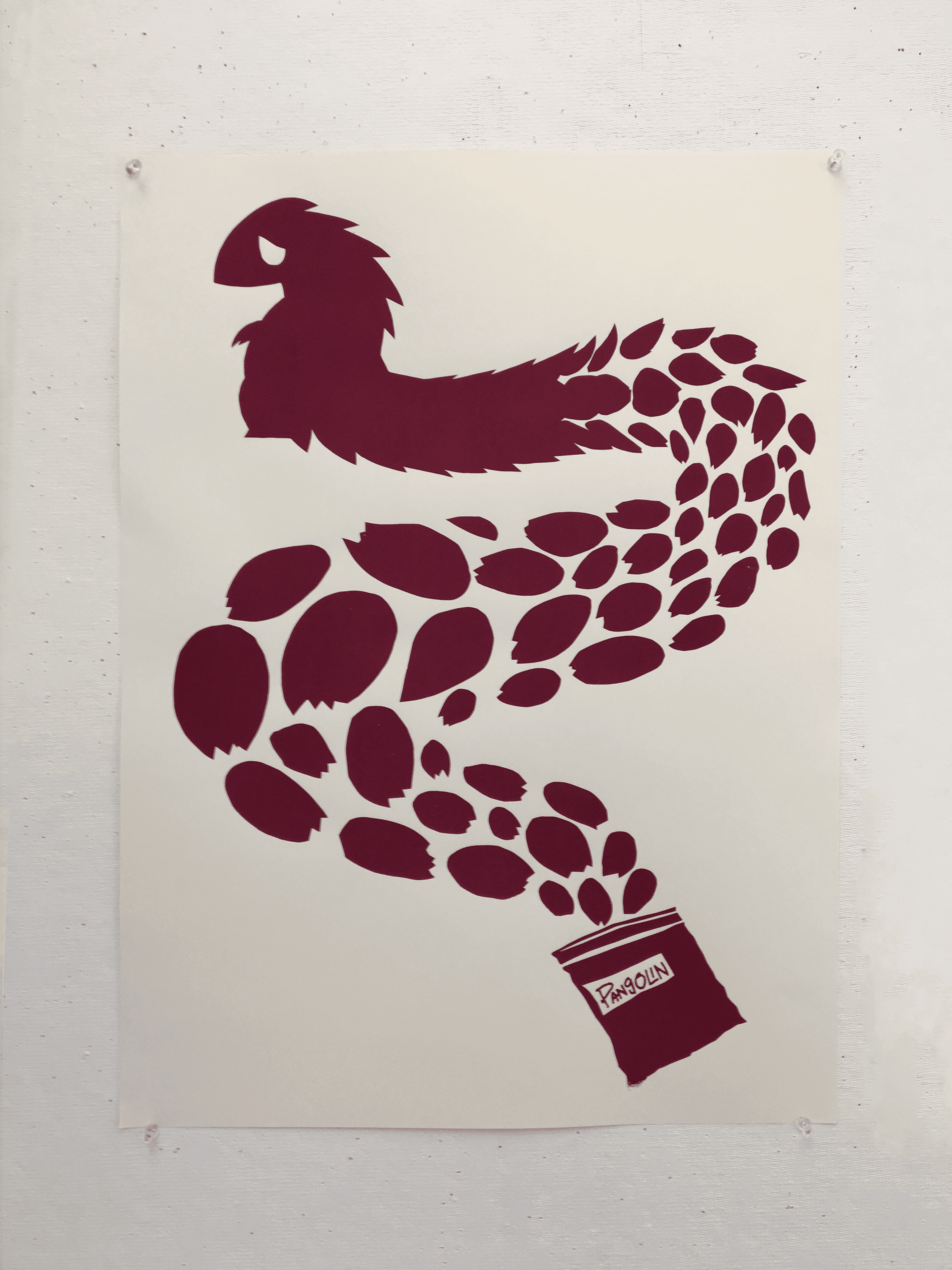 The starter poster to learn how to cut and use rubylith in the screenprinting process. We selected an endangered animal and an environmental issue out of a hat, then chose between the two. I drew pangolin and had to go with it. It's an exceedingly endangered animal that no one knows about, and is highly trafficked. I wanted to make the most of the latter and illustrate this in a way most people can understand. This poster was a Judge's Pick at the Annual Cornish Poster Show.