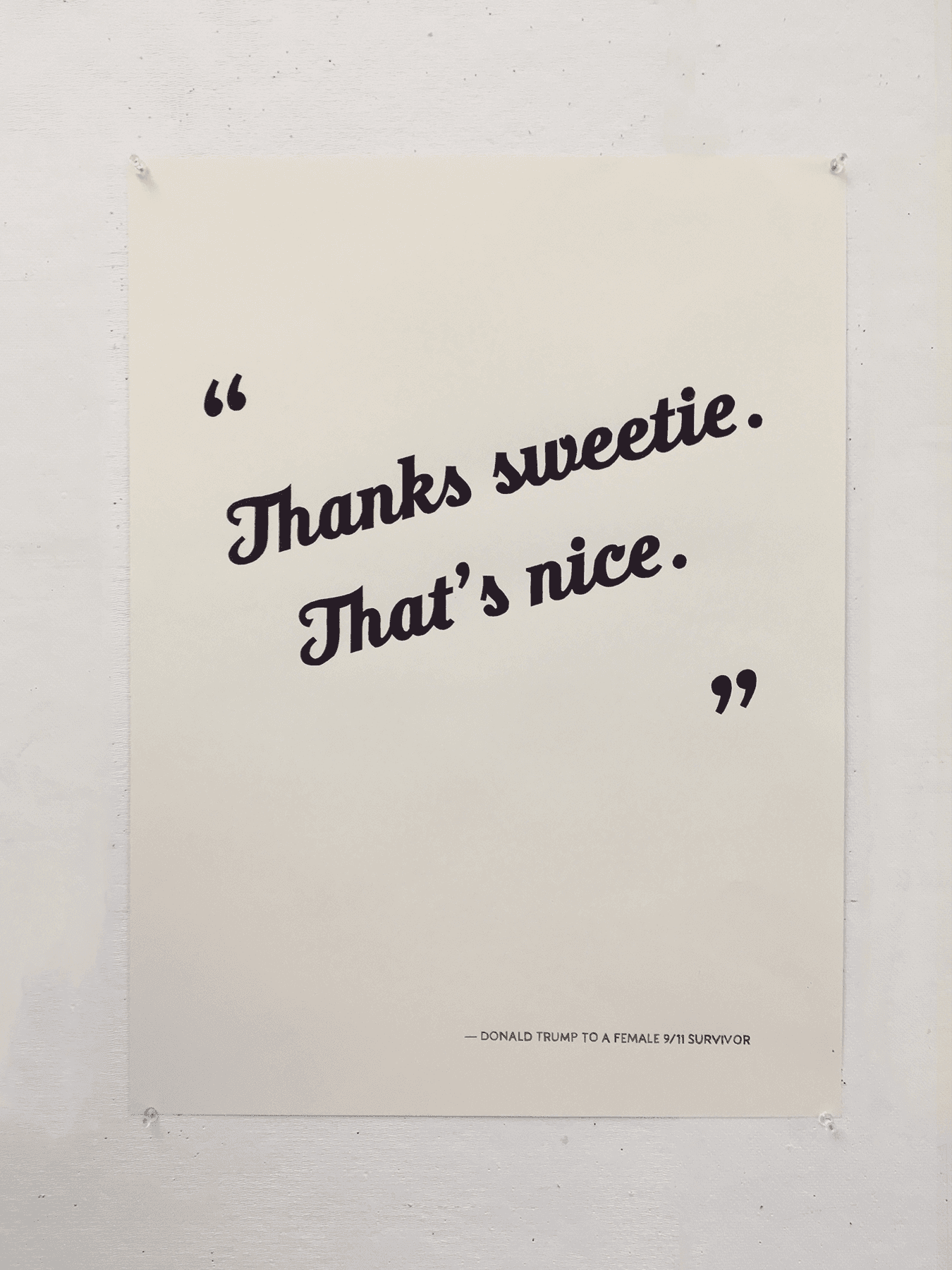 This is one the class went back and forth on, particularly with how vitriolic the election was. Ultimately the assigment came to be: do what you want. I wanted to capture a quote from Donald in a simple way, something that can speak for itself. Ultimately the result was simple but got the message across.