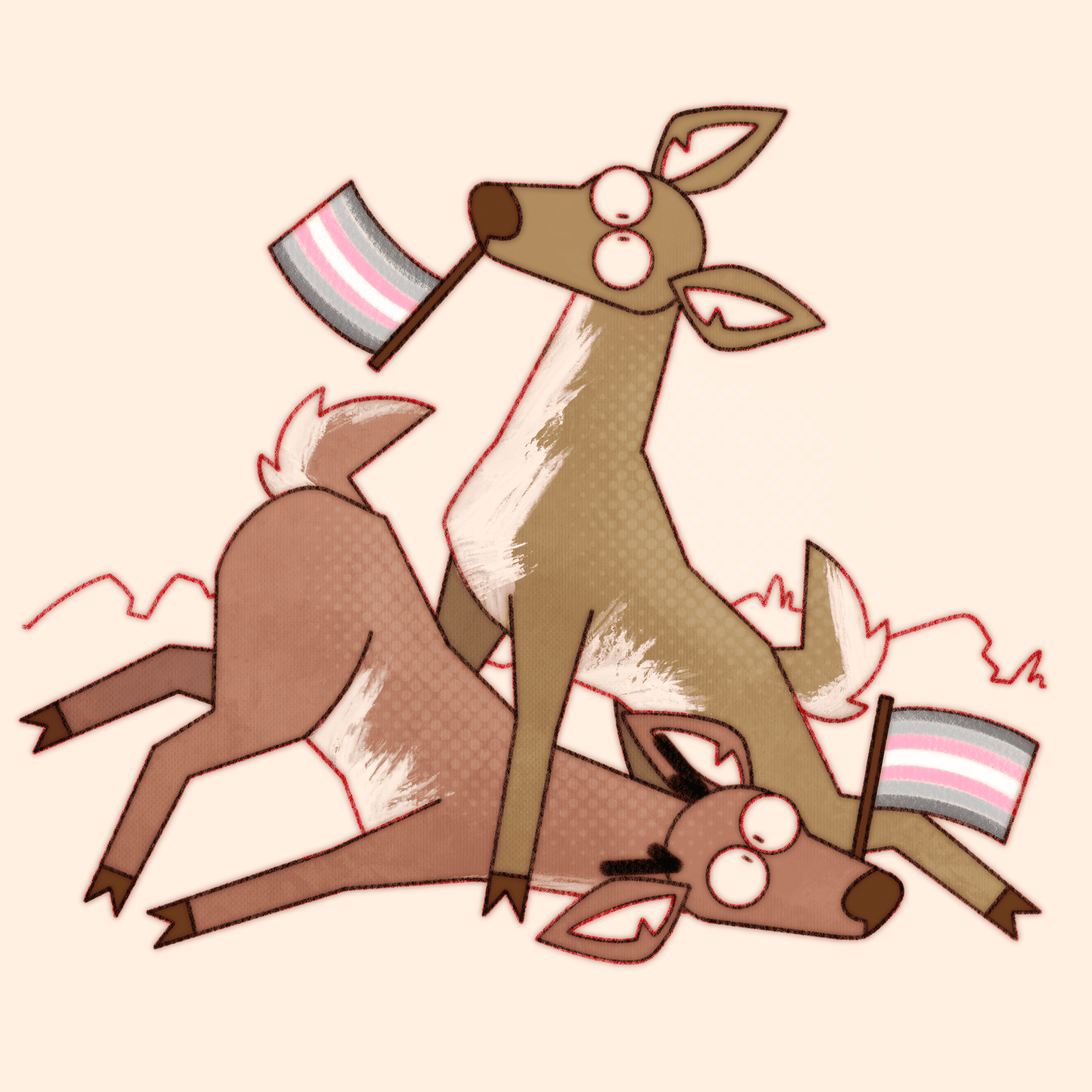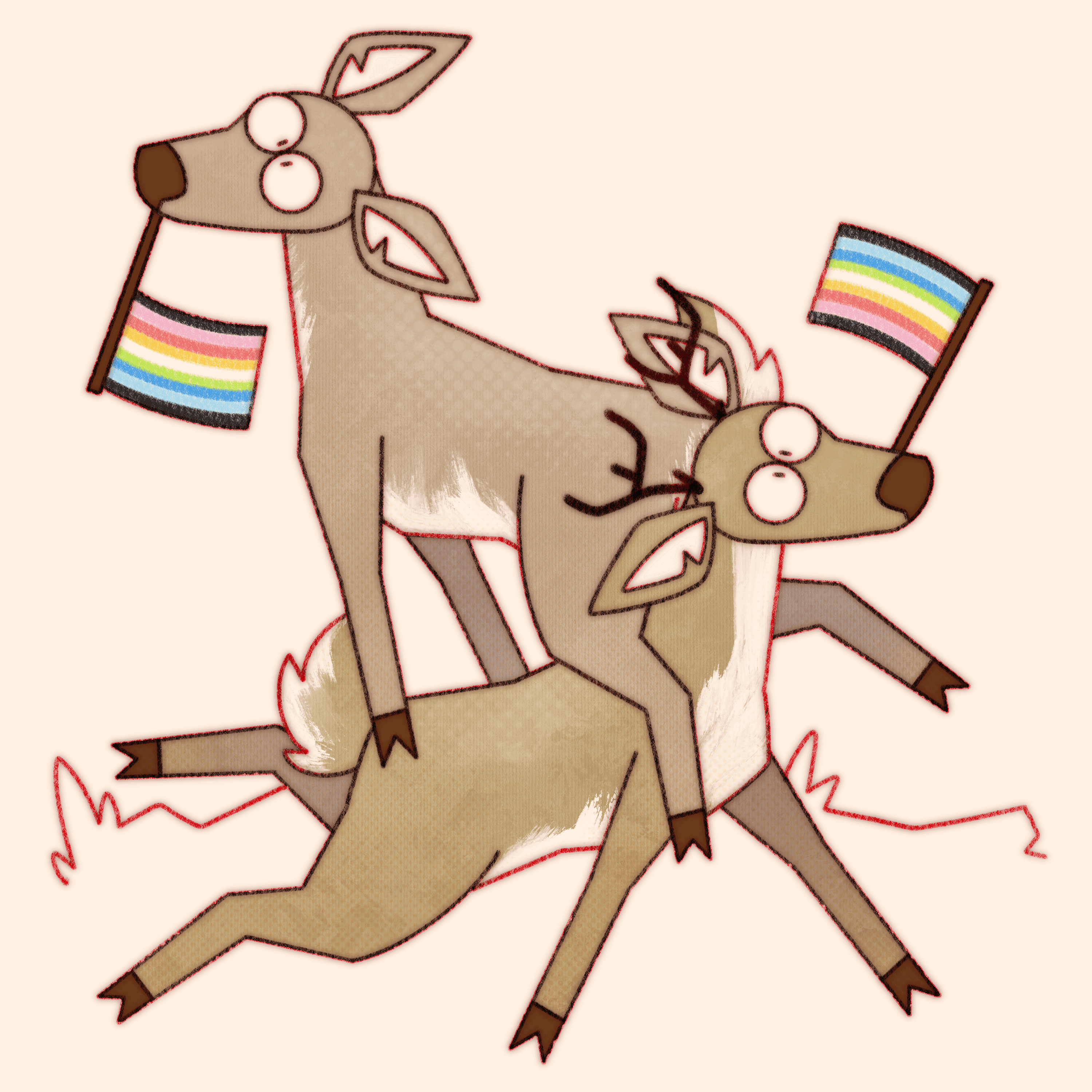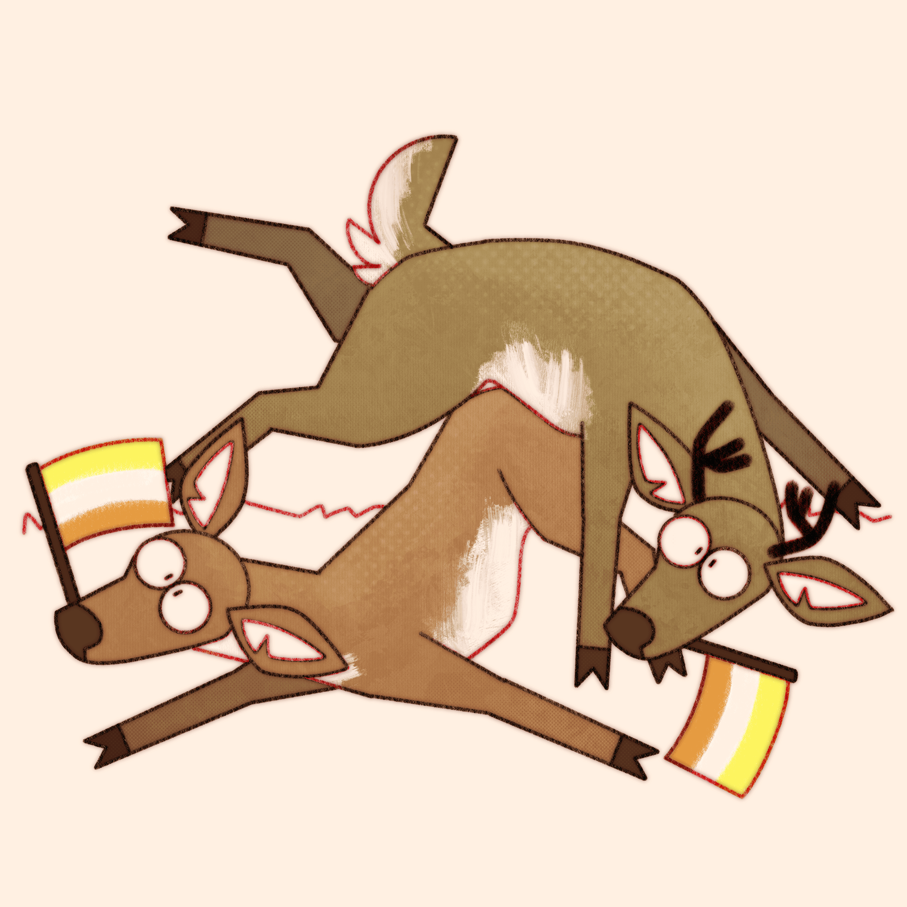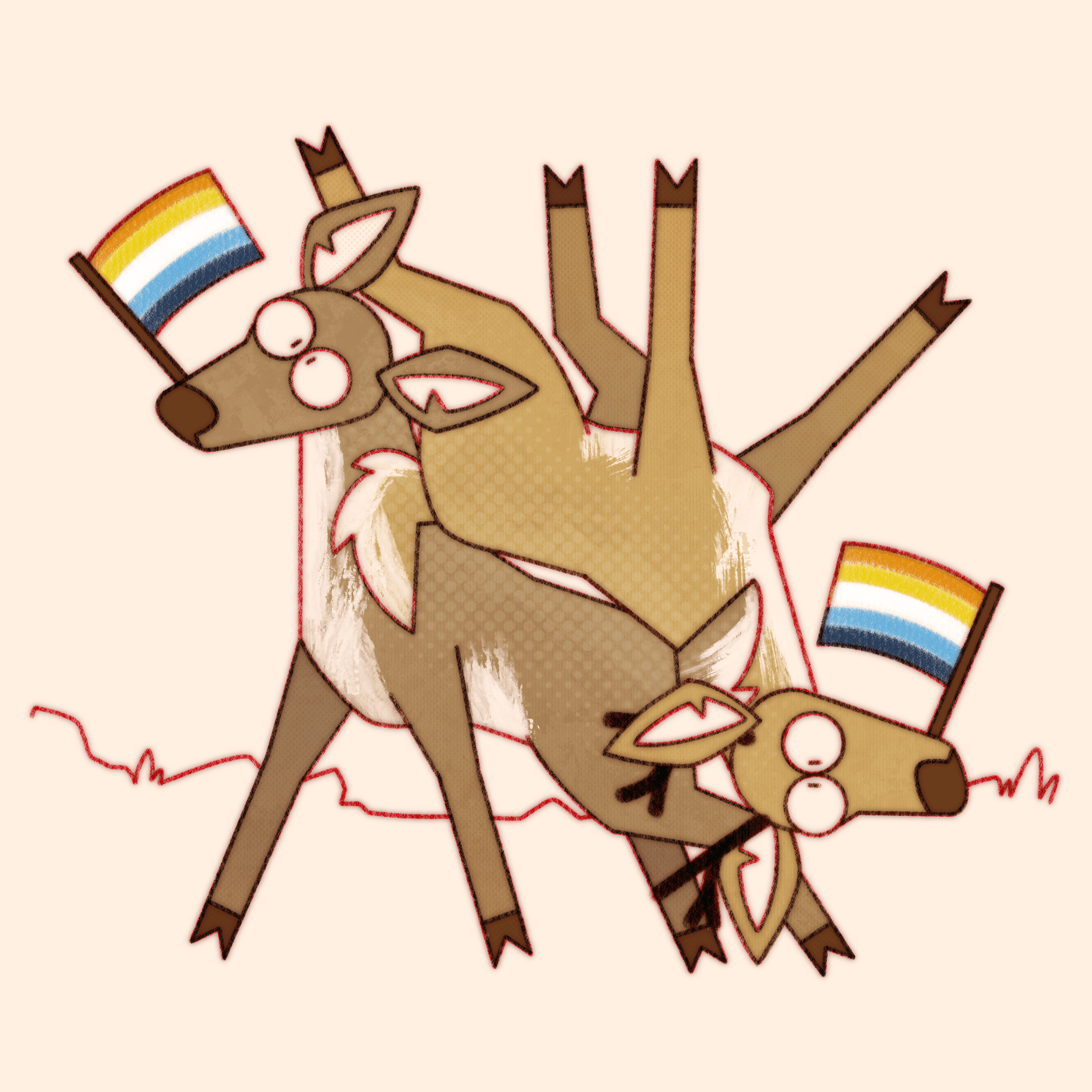 Truly what became the most difficult aspect of this ongoing project is not maintaining consistency in style and execution over the years, or studying pride flags and their corresponding niche queer communities, it’s coming up with new and interesting ways to pile deer haphazardly.