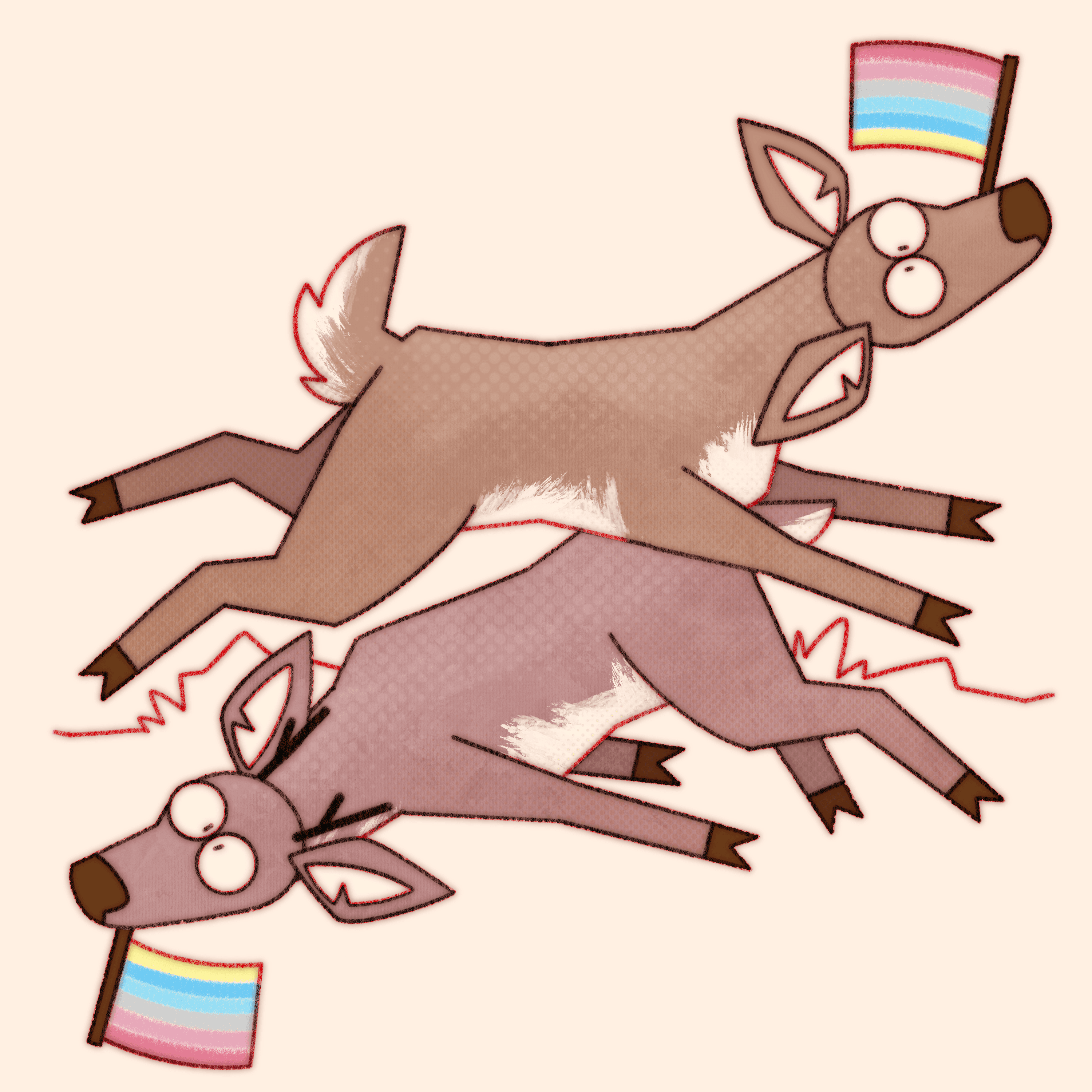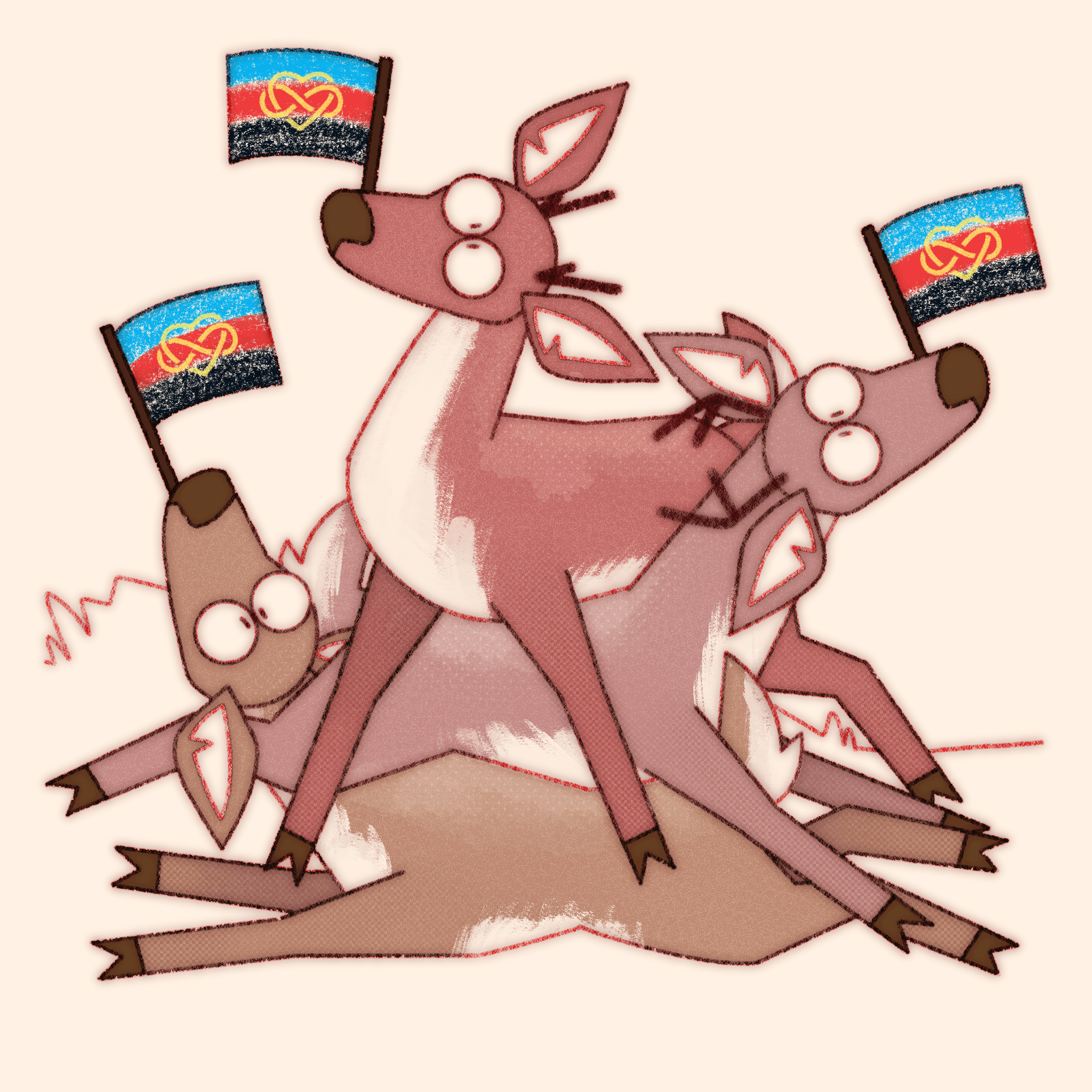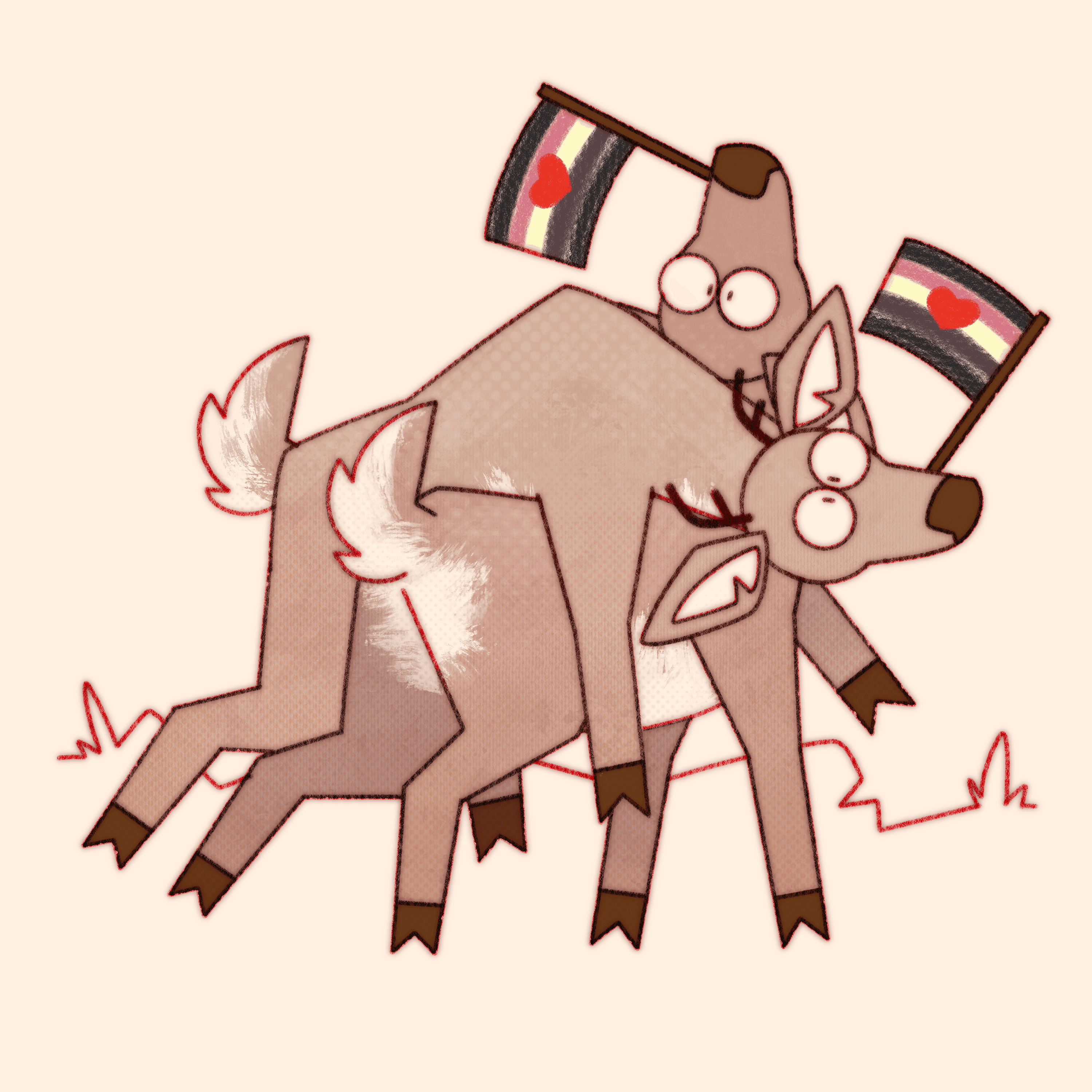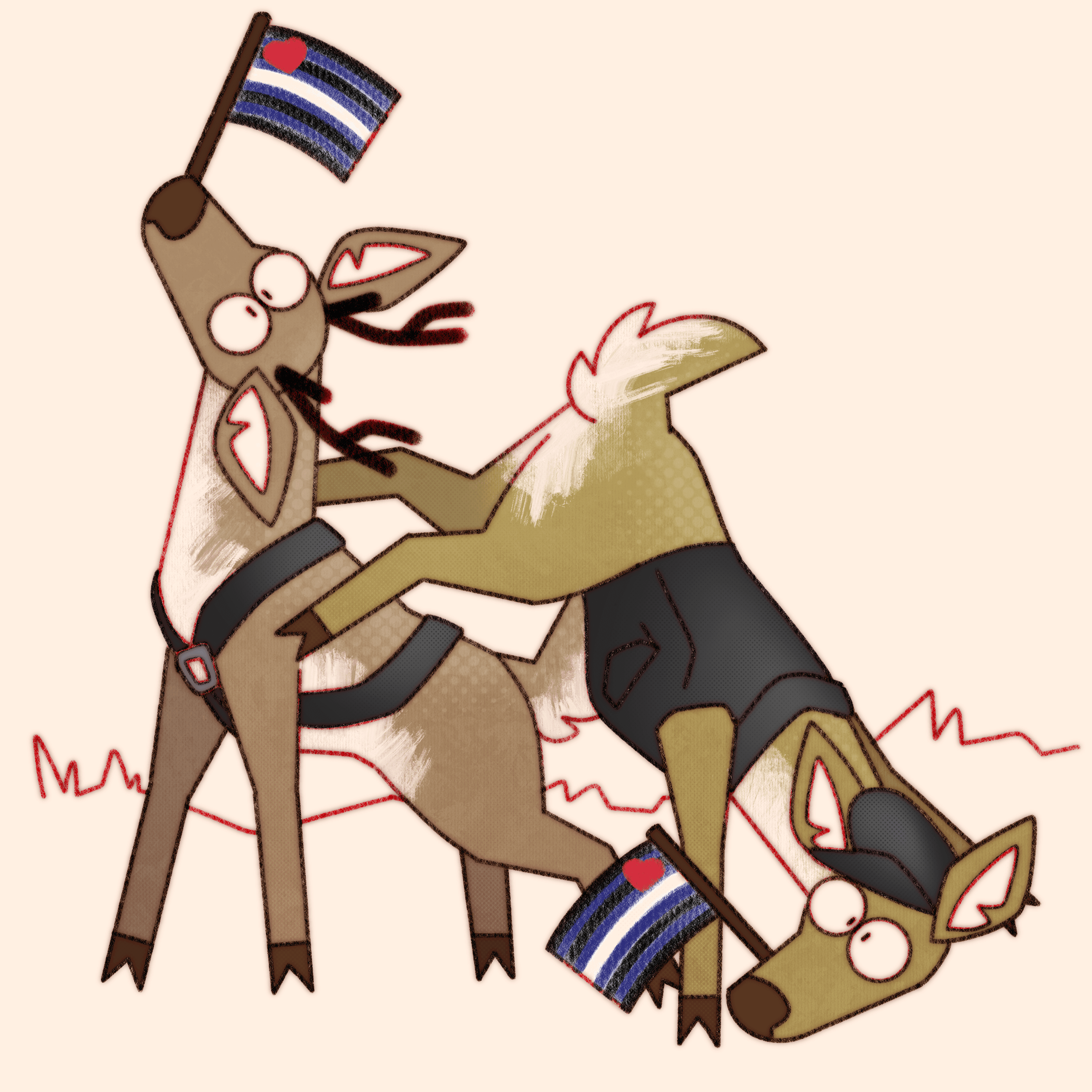 Truly what became the most difficult aspect of this ongoing project is not maintaining consistency in style and execution over the years, or studying pride flags and their corresponding niche queer communities, it’s coming up with new and interesting ways to pile deer haphazardly.