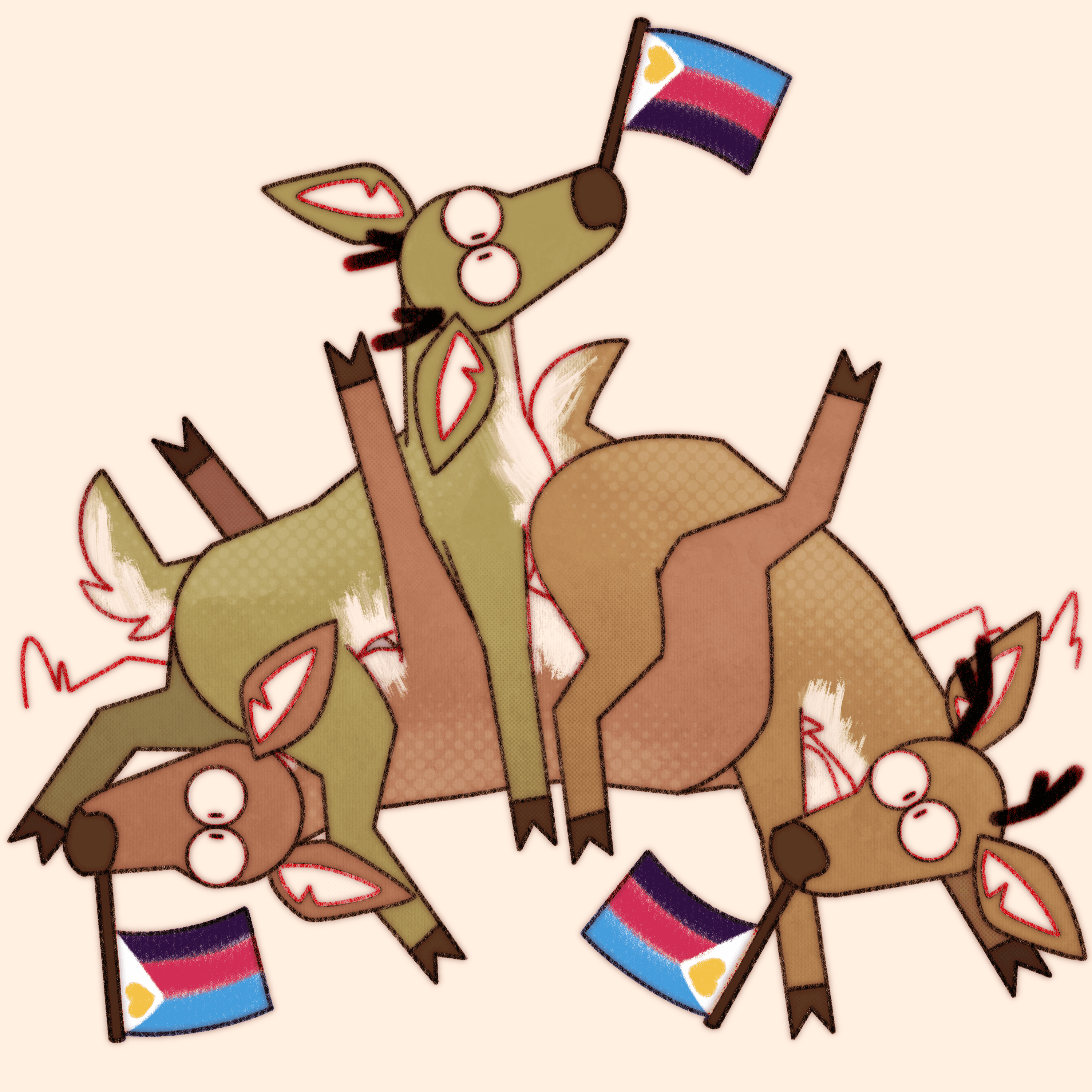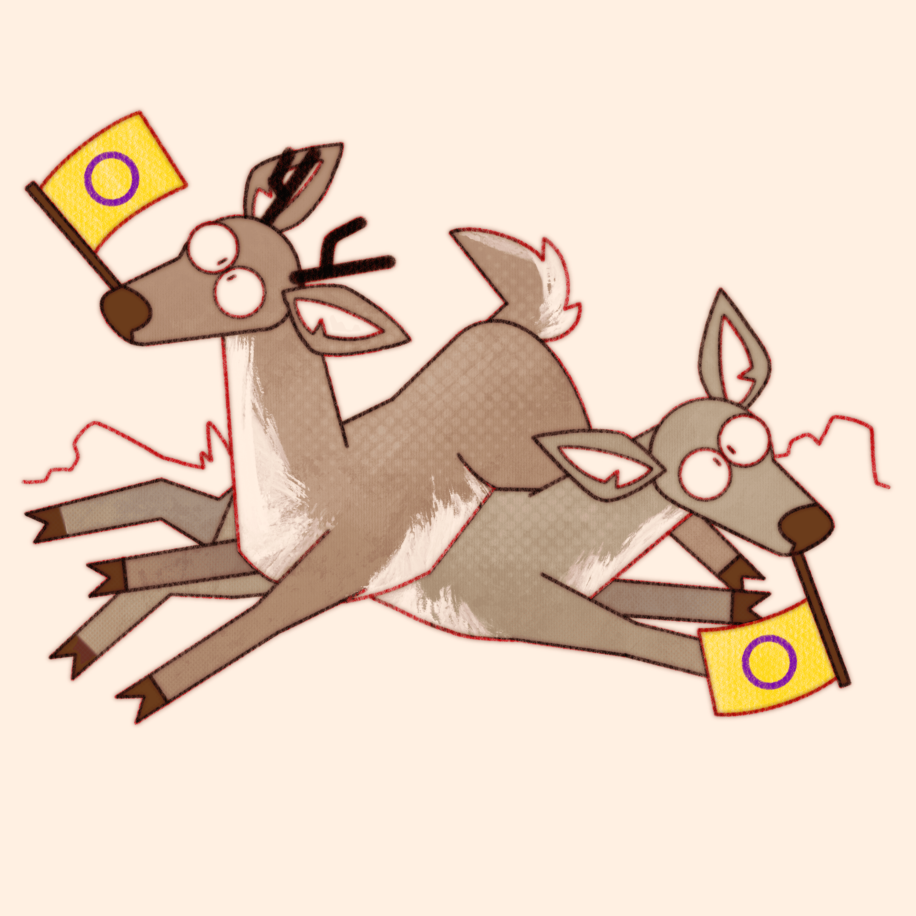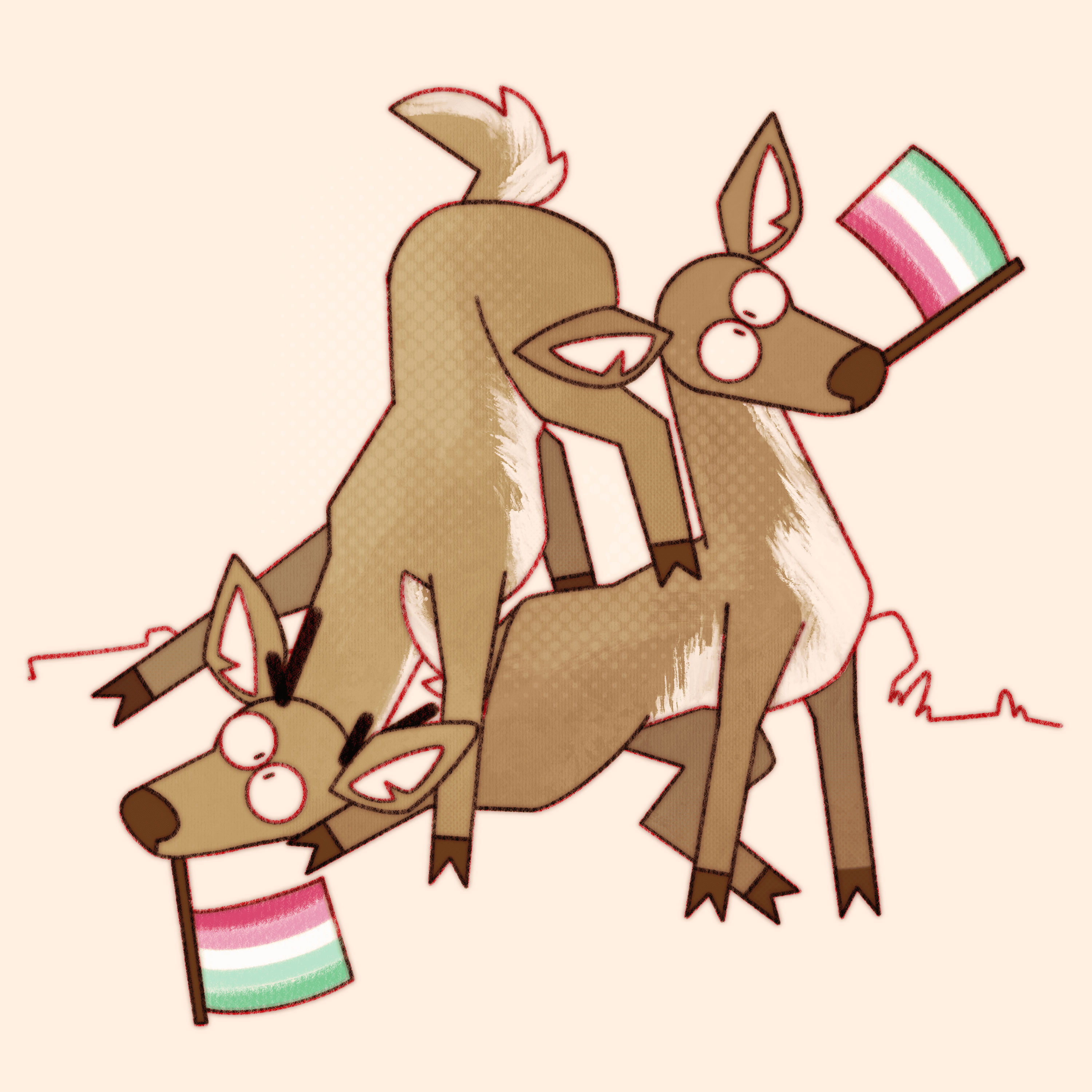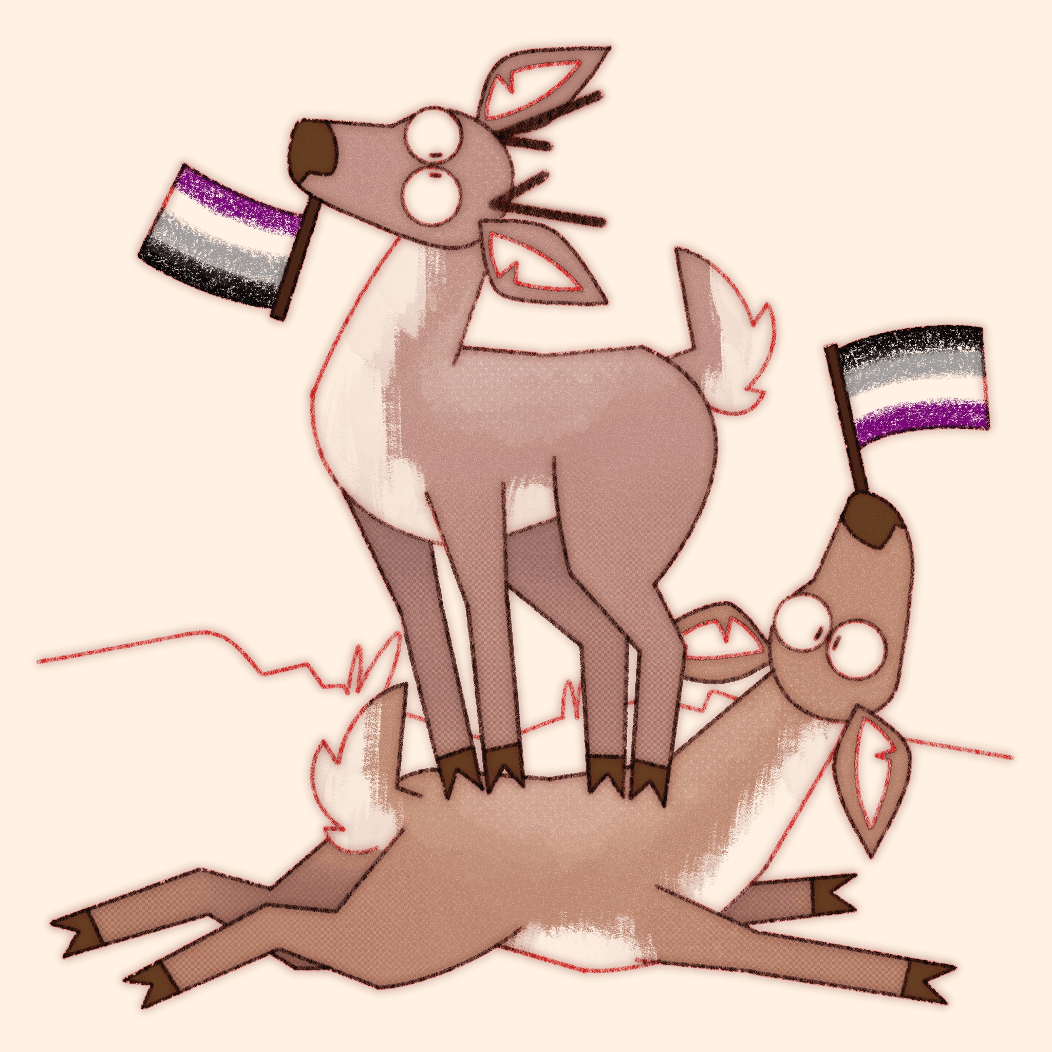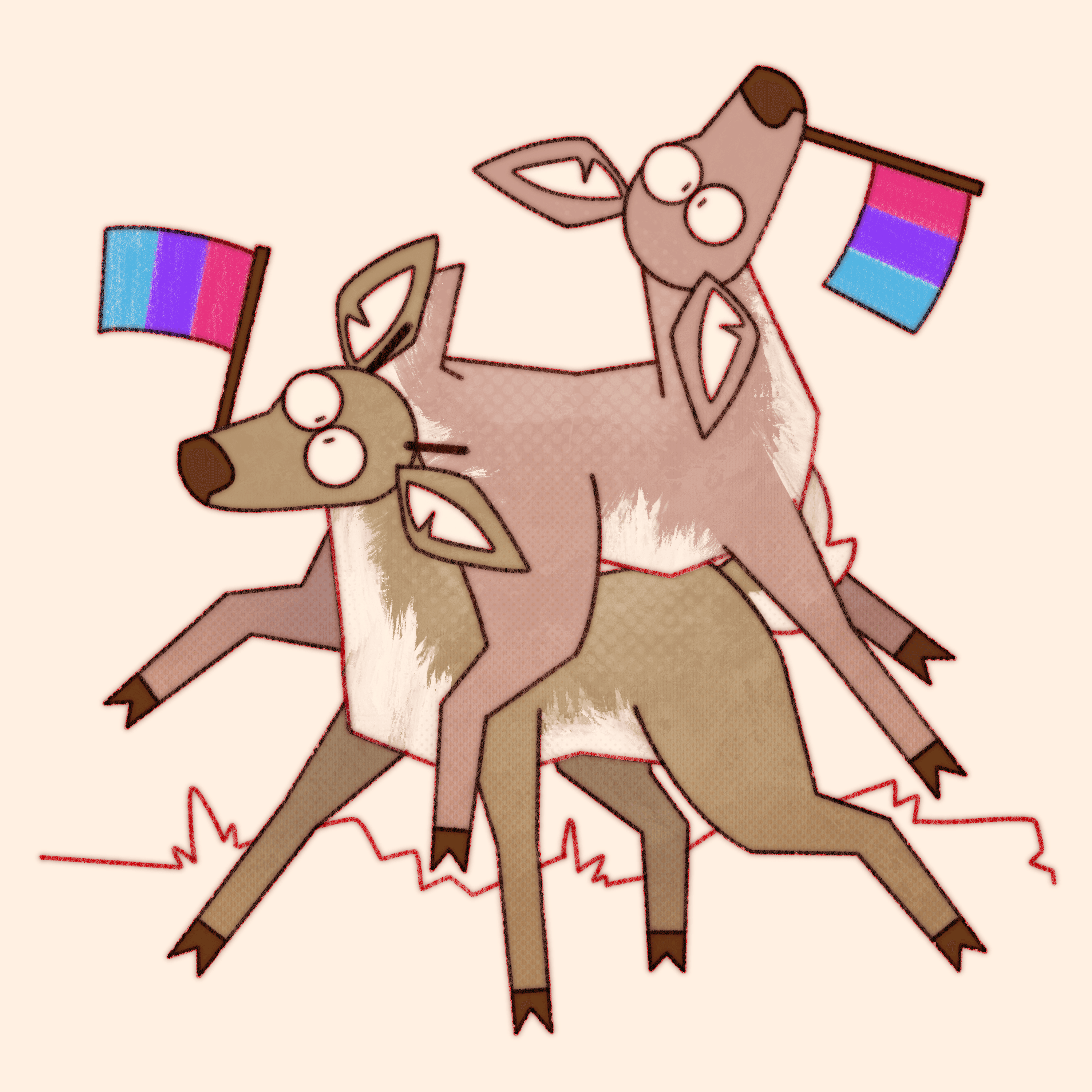 Truly what became the most difficult aspect of this ongoing project is not maintaining consistency in style and execution over the years, or studying pride flags and their corresponding niche queer communities, it’s coming up with new and interesting ways to pile deer haphazardly.