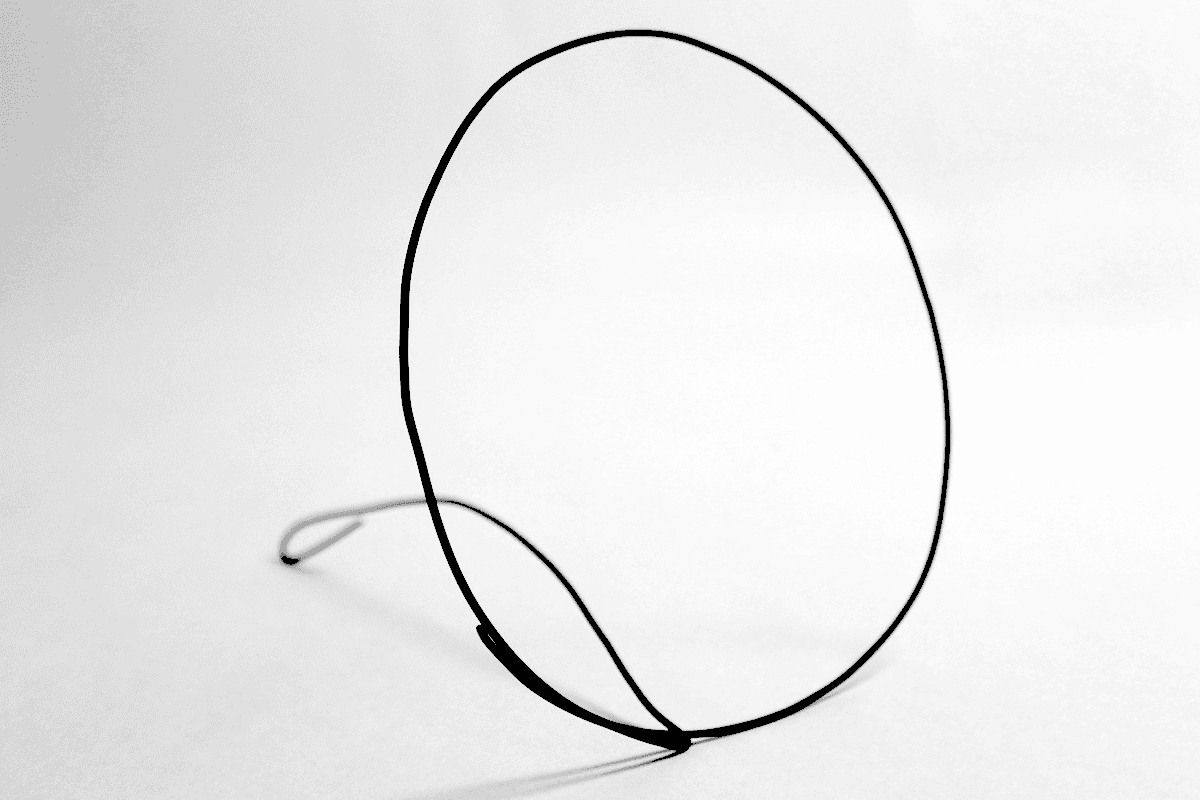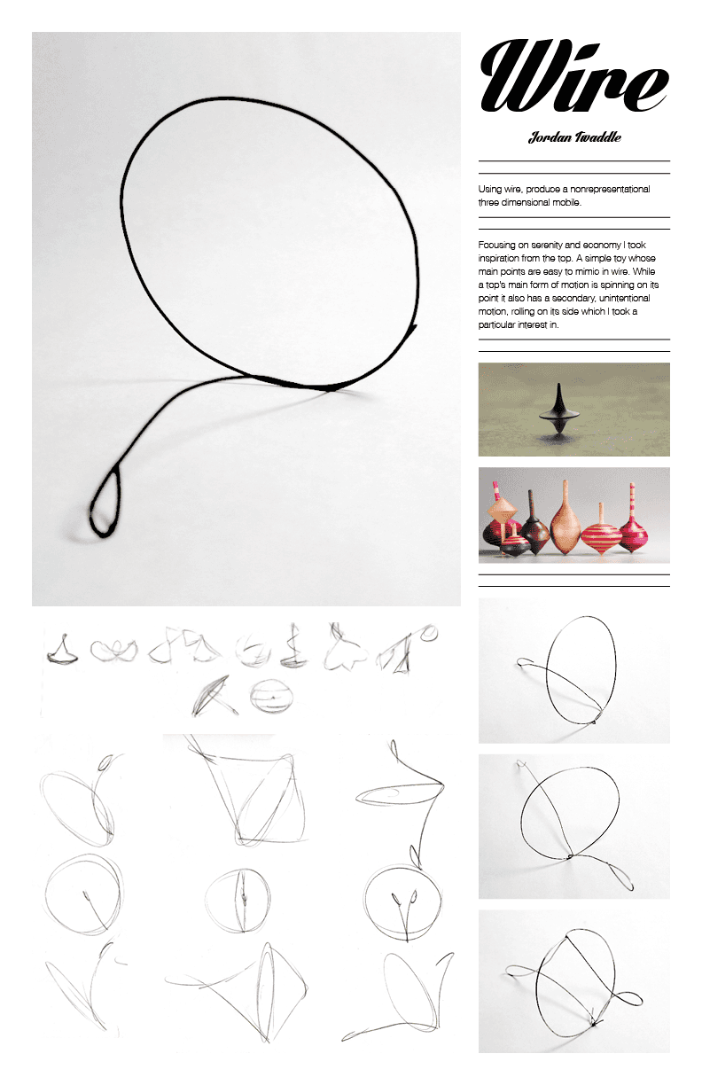 Focusing on serenity and economy I took inspiration from the top. A simple toy whose main points are easy to mimic in wire. While a top’s main form of motion is spinning on its point it also has a secondary, unintentional motion, rolling on its side which I took a particular interest in.
